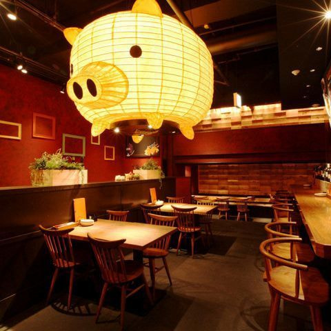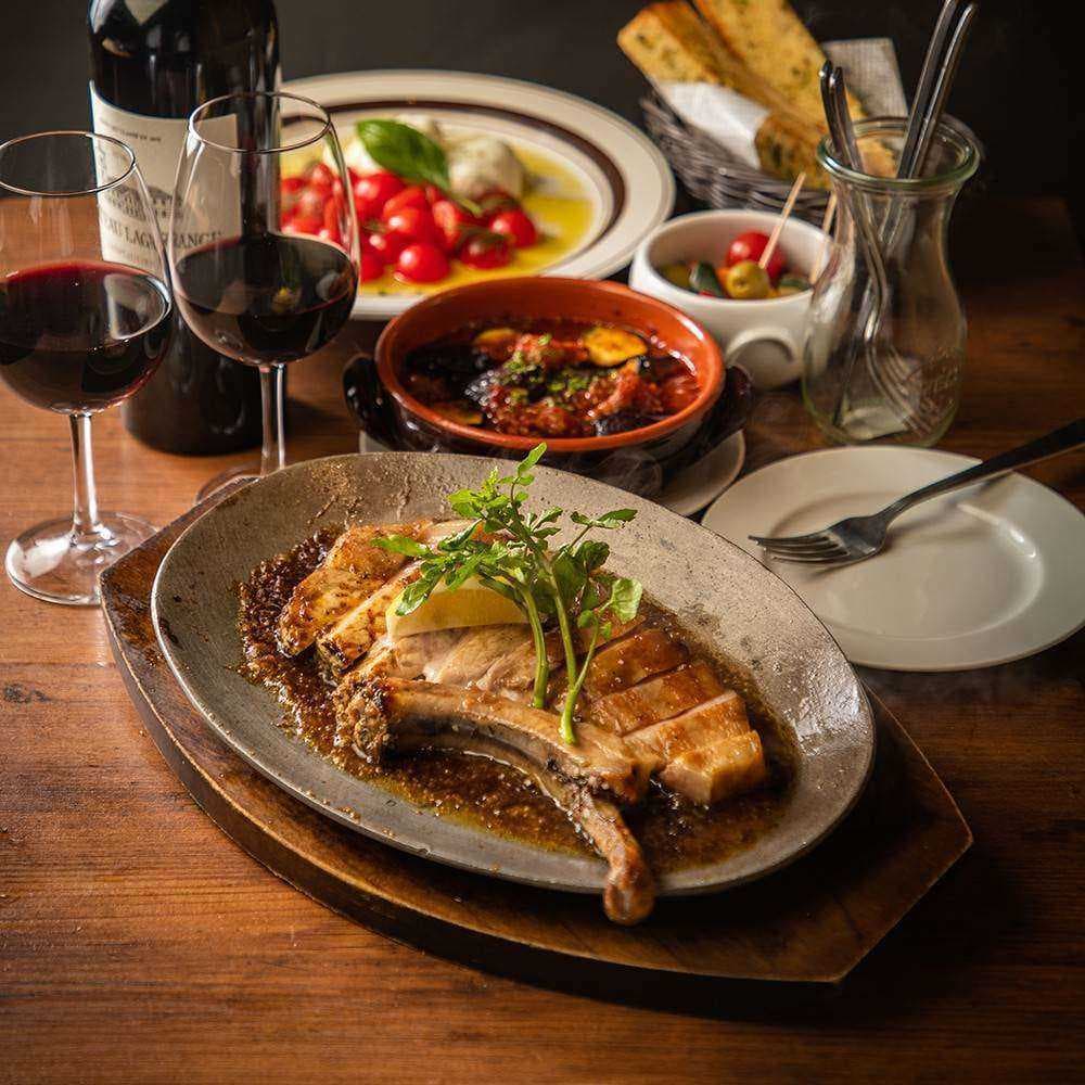 料理は48時間熟成 豚肩ロースのステーキなど、ワインとの相性ばっちりな豚料理をご用意しています。美味しい料理とワインや他飲み放題のお酒片手に話も弾むはず♪